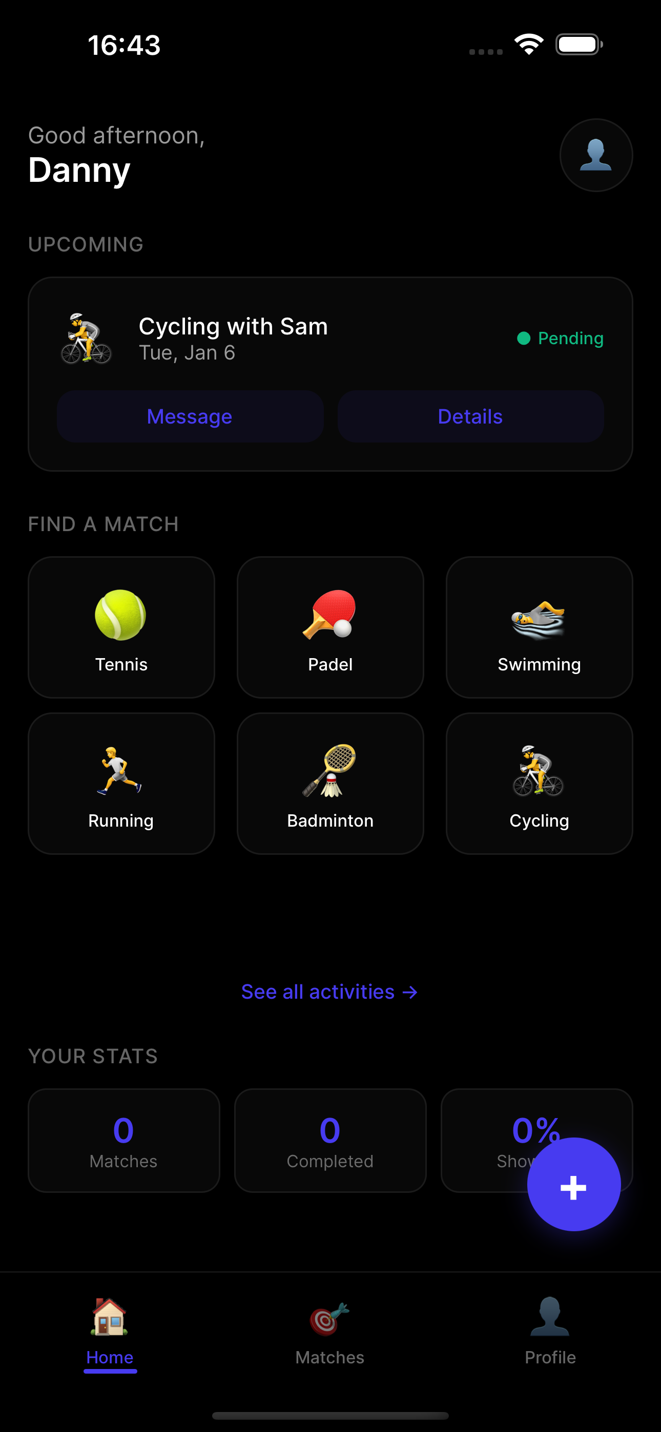 Real activities. Reliable people. Match with partners who show up for tennis, padel, running, cycling, and more. No noise, no flakes.